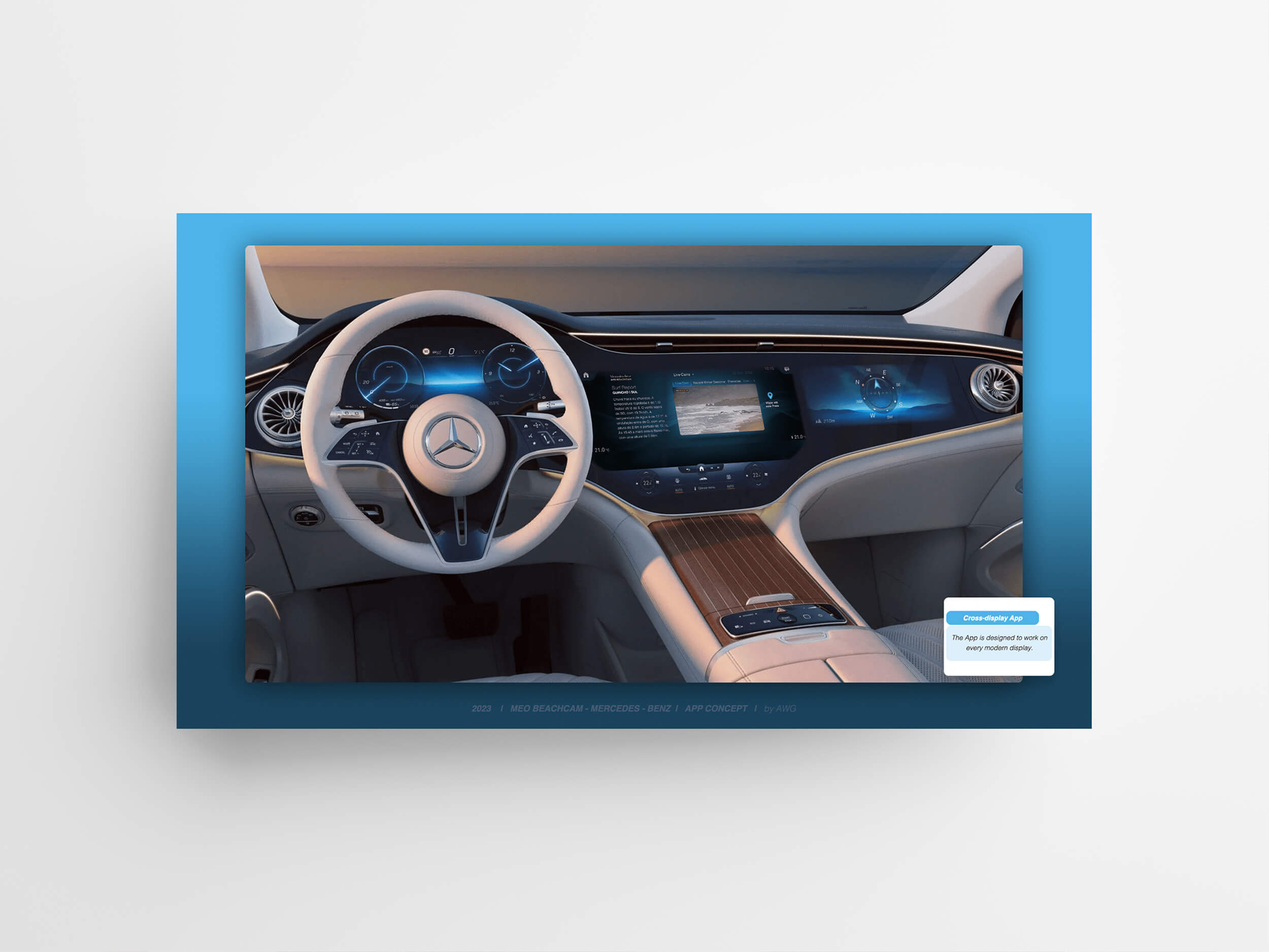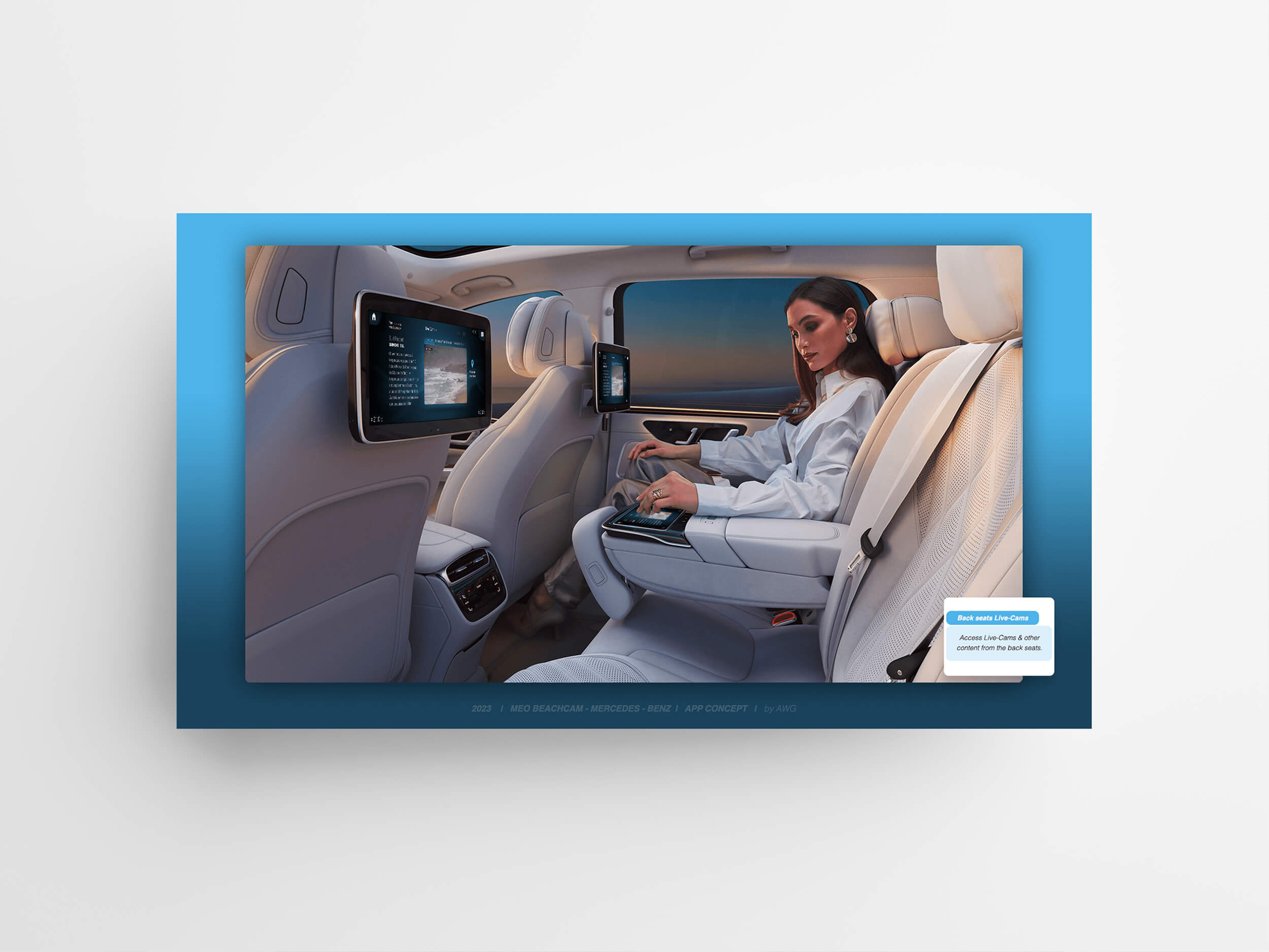 A meticulously crafted interface, combining elegance with a sporty aesthetic, would integrate all features of the renowned Meo Beachcam App into Mercedes-Benz iO electric automobiles.